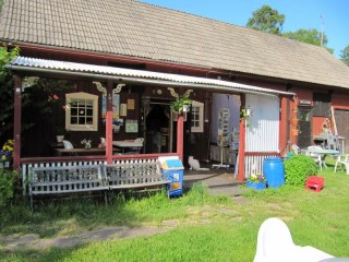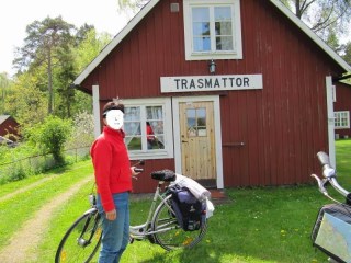 Ein kleines Stückchen weiter in Richtung Westen, gibt es auf der linken Seite der Straße ein Wohnhaus und im Garten ein kleines Häuschen auf dem das Schild Trasmattor steht. Trasmattor sind diese Flickenteppiche, die hier in Schweden oft in Heimarbeit gewebt werden und dann auch privat verkauft werden.