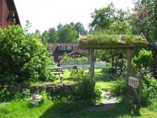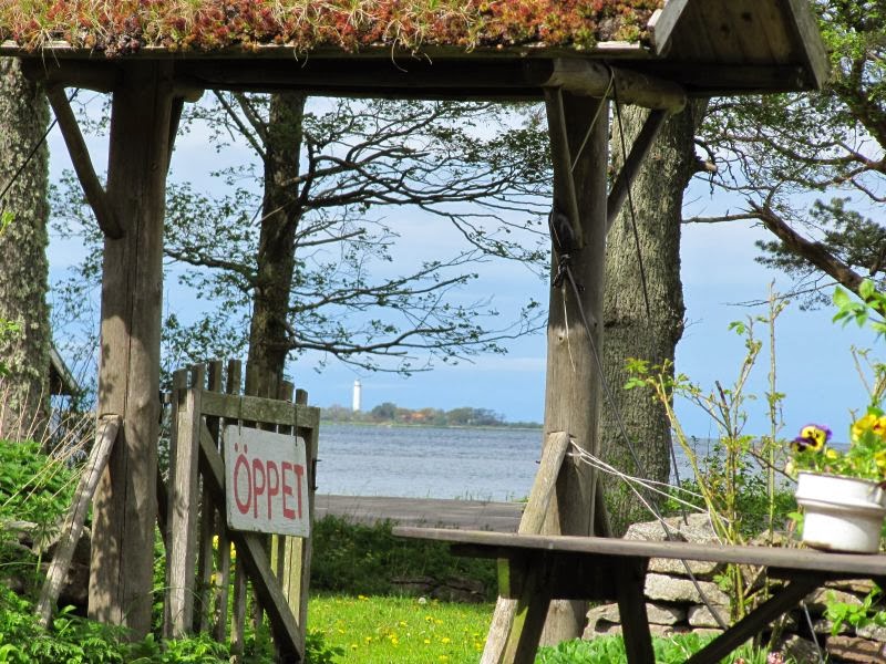 Im Garten sitzend, schaut man durch das Törchen hinaus über den Grankullarviken zum Leuchtturm