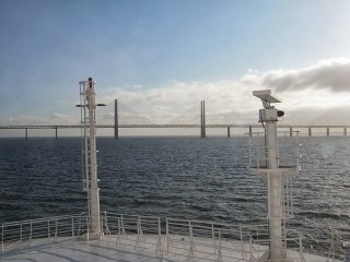 Morgens so ca. 5:30 Uhr bietet sich dieser Blick, wenn wir unter der Öresundbrücke, sie ist die weltweit längste Schrägseilbrücke, durchfahren: