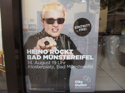 Ab 19:00 Uhr „rockte“ Heino Bad Münstereifel, aber als wir dann um 19:15 Uhr am Klosterplatz ankamen, durften wir nicht mehr auf den Platz, da er bereits überfüllt war….so wirklich traurig waren wir darüber nicht. Daher hier keine Live-Aufnahme von mir an dieser Stelle, sondern nur ein Foto vom Plakat: