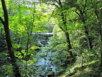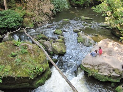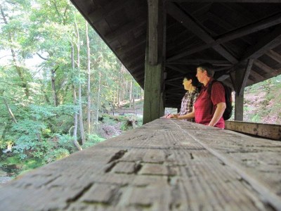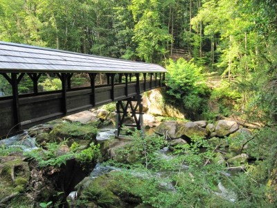Es gibt eine überdachte Brücke, von wo man den Fluss von oben gut sehen kann.