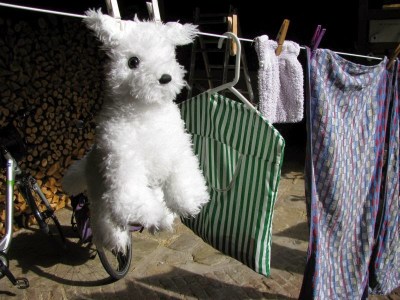 Als ich nach Hause kam, hing bei dem schönen Wetter die Wäsche auf der Leine. Besonders süß sah der Therapiehund von Brigitte aus, der an seinen Ohren hing und trocknete: