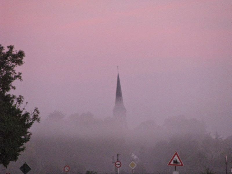 Heute morgen (Sonntag) musste ich ausnahmsweise auf die Arbeit fahren. Bei uns gibt es viele Mitarbeiter, die krank sind und so musste ich heute einspringen. Um 7:00 Uhr heute morgen ging gerade die Sonne auf und der Morgentau stieg hoch.