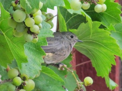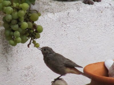 Bei den Blaumeisen glaube ich, das sie nur die Raupen, Spinnen usw. aus der Rebe holen, aber allen anderen, sogar den Spatzen schmecken die Trauben sehr gut.