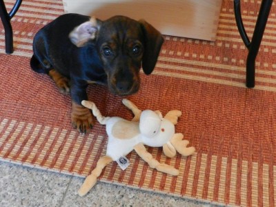 Brigittes Schwester und ihr Mann haben seid kurzem einen Welpen, einen kleinen Rauhaardackel, ein Mädchen mit Namen „Grandel“ und auch Brigitte ist ganz vernarrt in ihn.