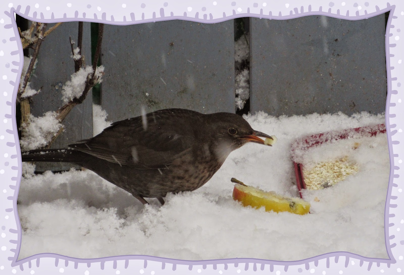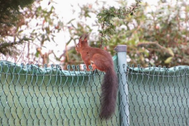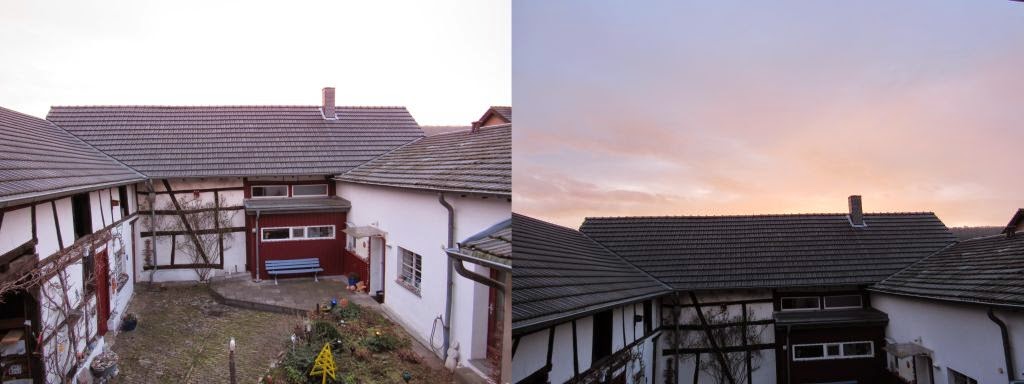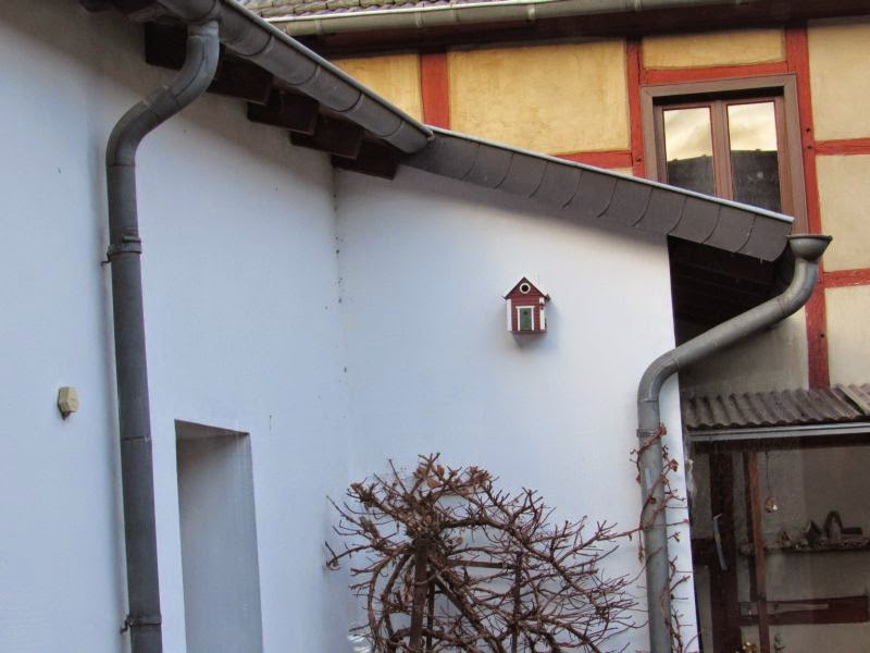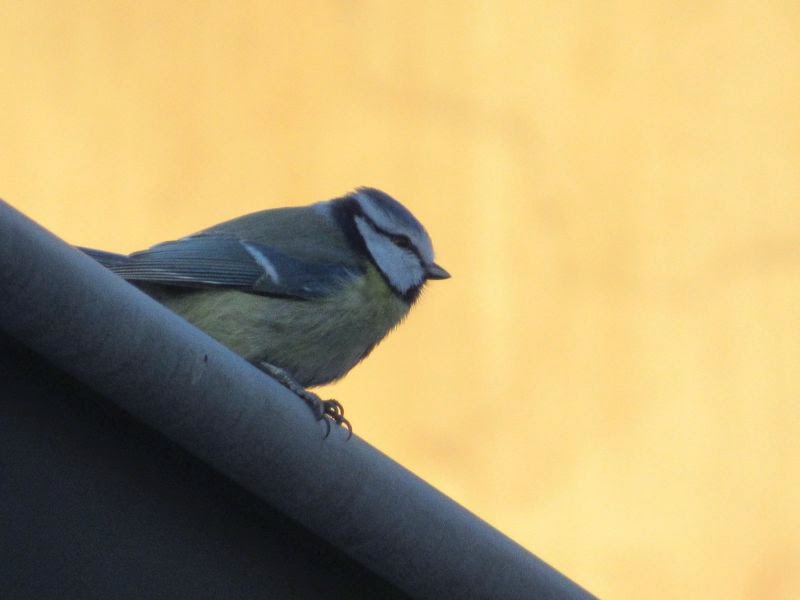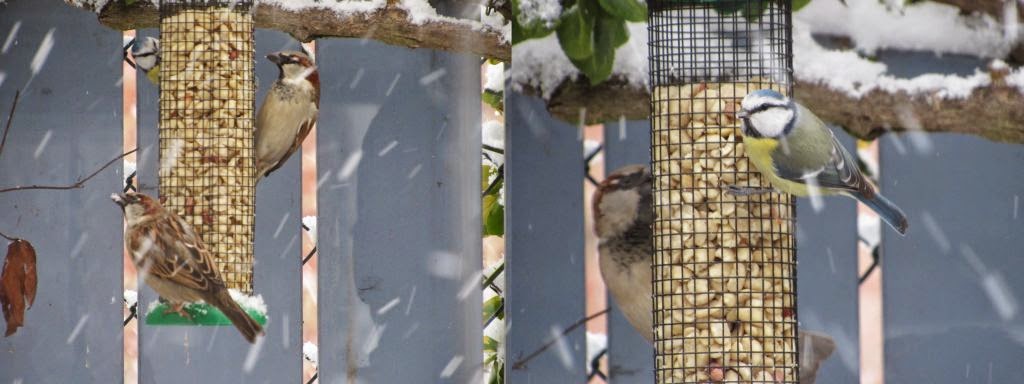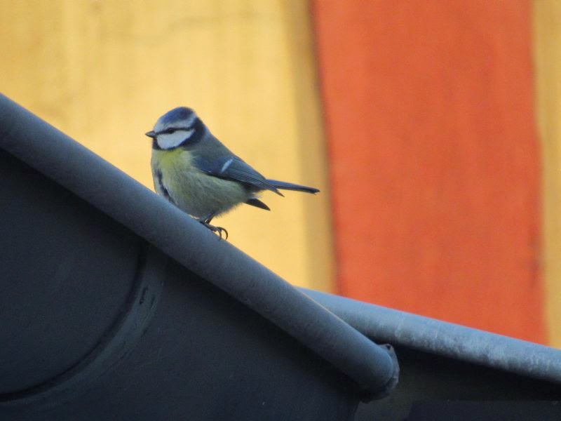Leider musste ich erst meine Kamera holen, da war die Entscheidung schon gefallen. Die Blaumeisen waren scheinbar die Sieger. Sie hielten sich dann noch eine ganze Zeit um das Vogelhaus herum auf. Flogen zum Haus, dann auf die Dachrinne, dann in die Hortensie, so als wollten sie die einzelnen Strecken abmessen oder markieren.