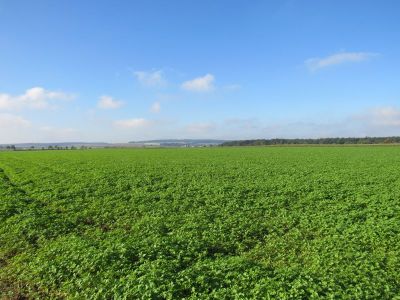 Grün ist die Landschaft im Moment überwiegend, weil auf sehr vielen Feldern jetzt Gründüngung wächst, wie hier oben zu sehen.