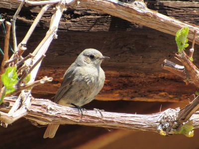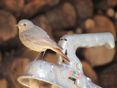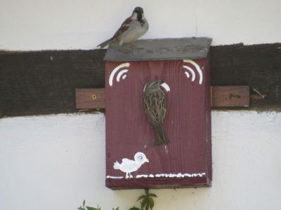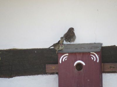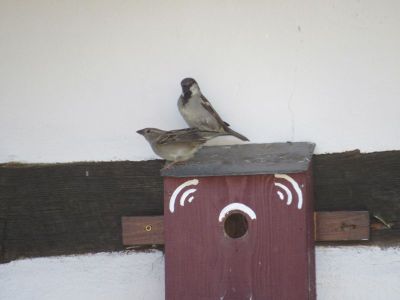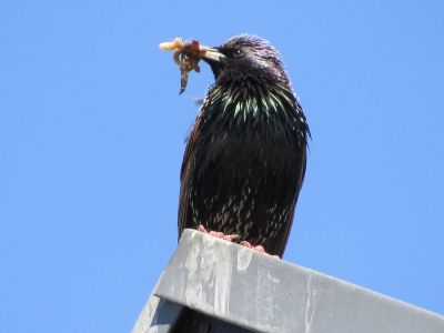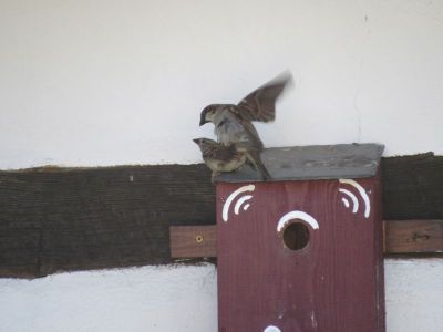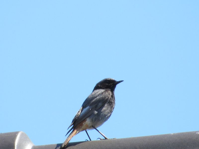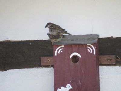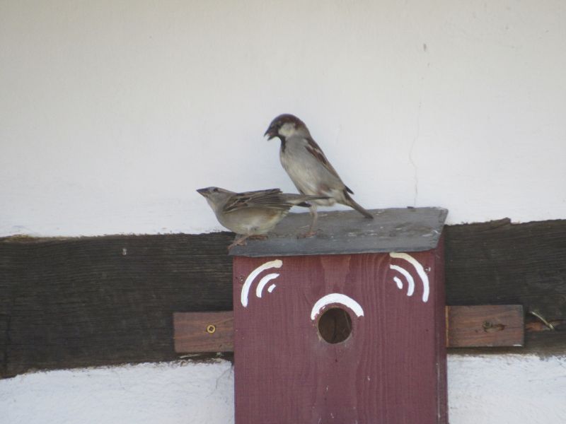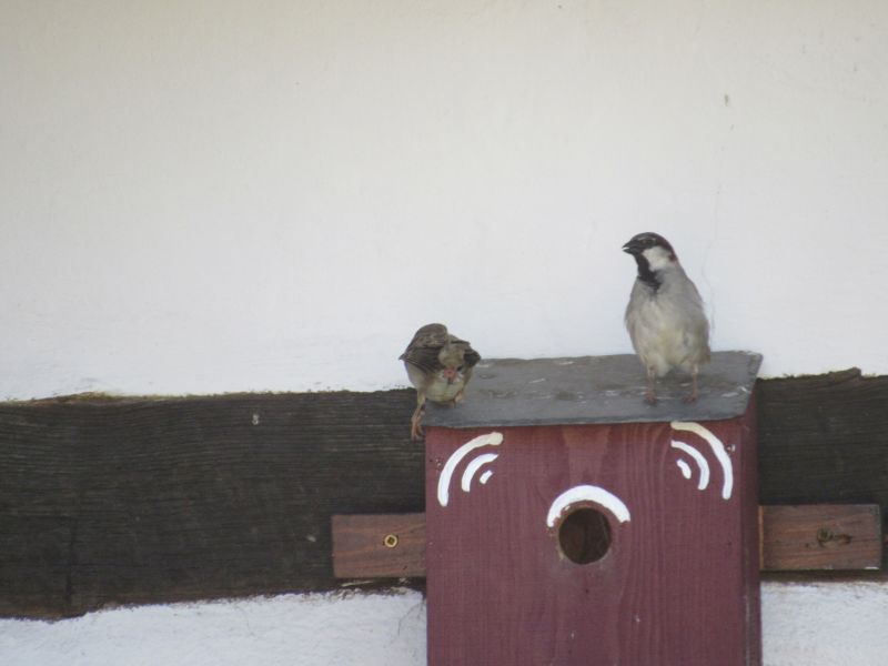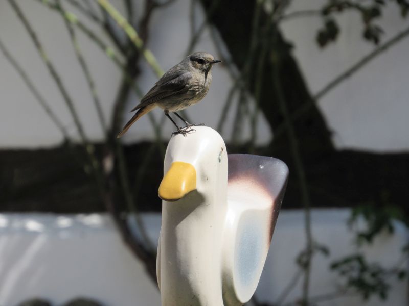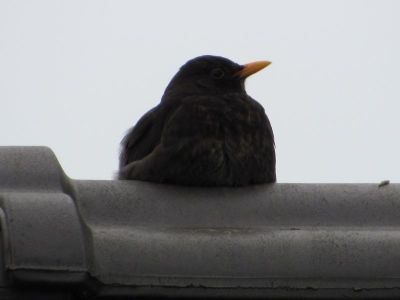 Die Amsel liegt oben auf dem Dachfirst, und bewacht alles, weil seine „Frau“ im Hof brütet.