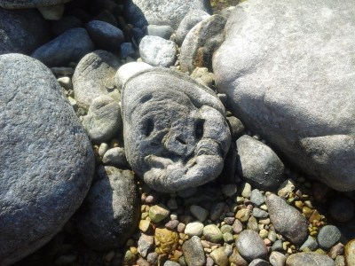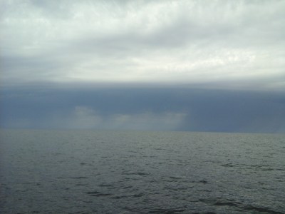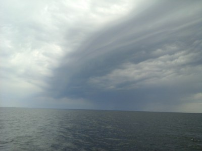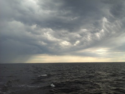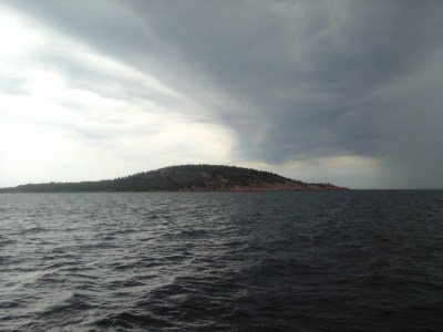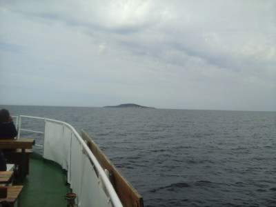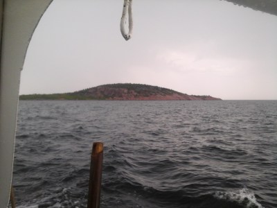 Ca. 20 Minuten bevor wir die Blaue Junfrau erreichen, fängt es an zu regnen, Gewitter geht los, alle Leute unter Deck. Das Schiff kommt an die Anlegestelle unf es gibt eine Durchsage, das es zu gefährlich ist auf die Insel zugehen, das wir umkehren und nach Byxelkrok zurück fahren.