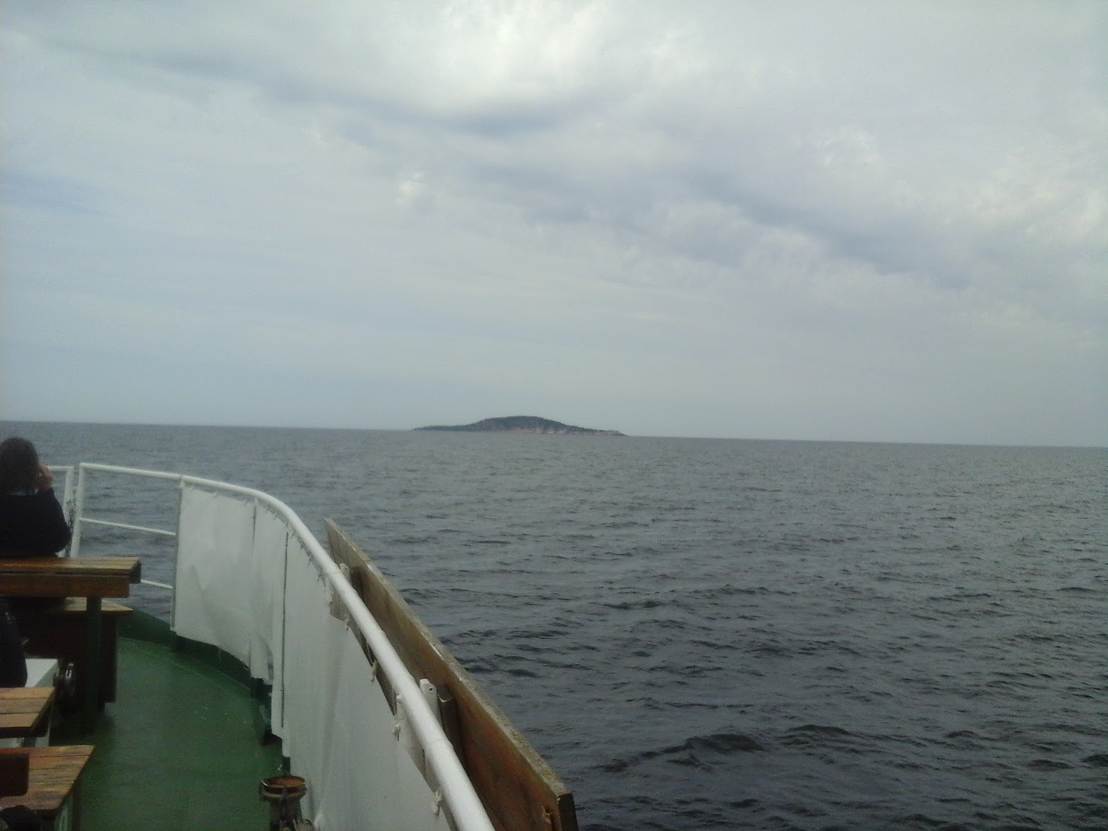 Gestern Abend haben wir einen schwedisch besprochenen Anrufbeantworter abgehört, die Fahrt heute findet statt. Wir also pünktlich um 9 Uhr im Hafen und mit uns noch 25 weitere Reisewilligen. Das Wetter ist heute nicht so super wie in der vergangenen Zeit, bewölkt aber ok. Die Fahrt zur Insel soll ca. 1 1/2 Stunden dauern. Als wir eine halbe Stunde unterwegs sind, bauen sich gewaltige Regenwolken auf, wir bekommen Anweisungen wie wir uns bei Regen auf der aus Granitfelsen bestehenden Insel verhalten sollen. Bei Regen dürfen wir nicht weitergehen, sondern müssen warten bis es aufhört, plus 10 Minuten.