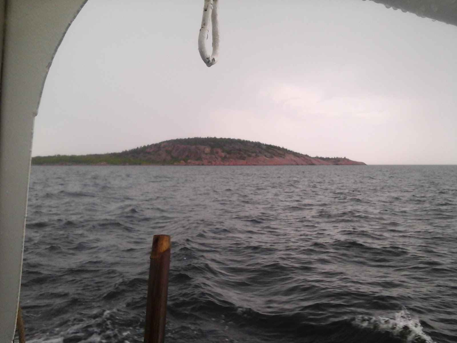 Ca. 20 Minuten bevor wir die Blaue Junfrau erreichen, fängt es an zu regnen, Gewitter geht los, alle Leute unter Deck. Das Schiff kommt an die Anlegestelle unf es gibt eine Durchsage, das es zu gefährlich ist auf die Insel zugehen, das wir umkehren und nach Byxelkrok zurück fahren.