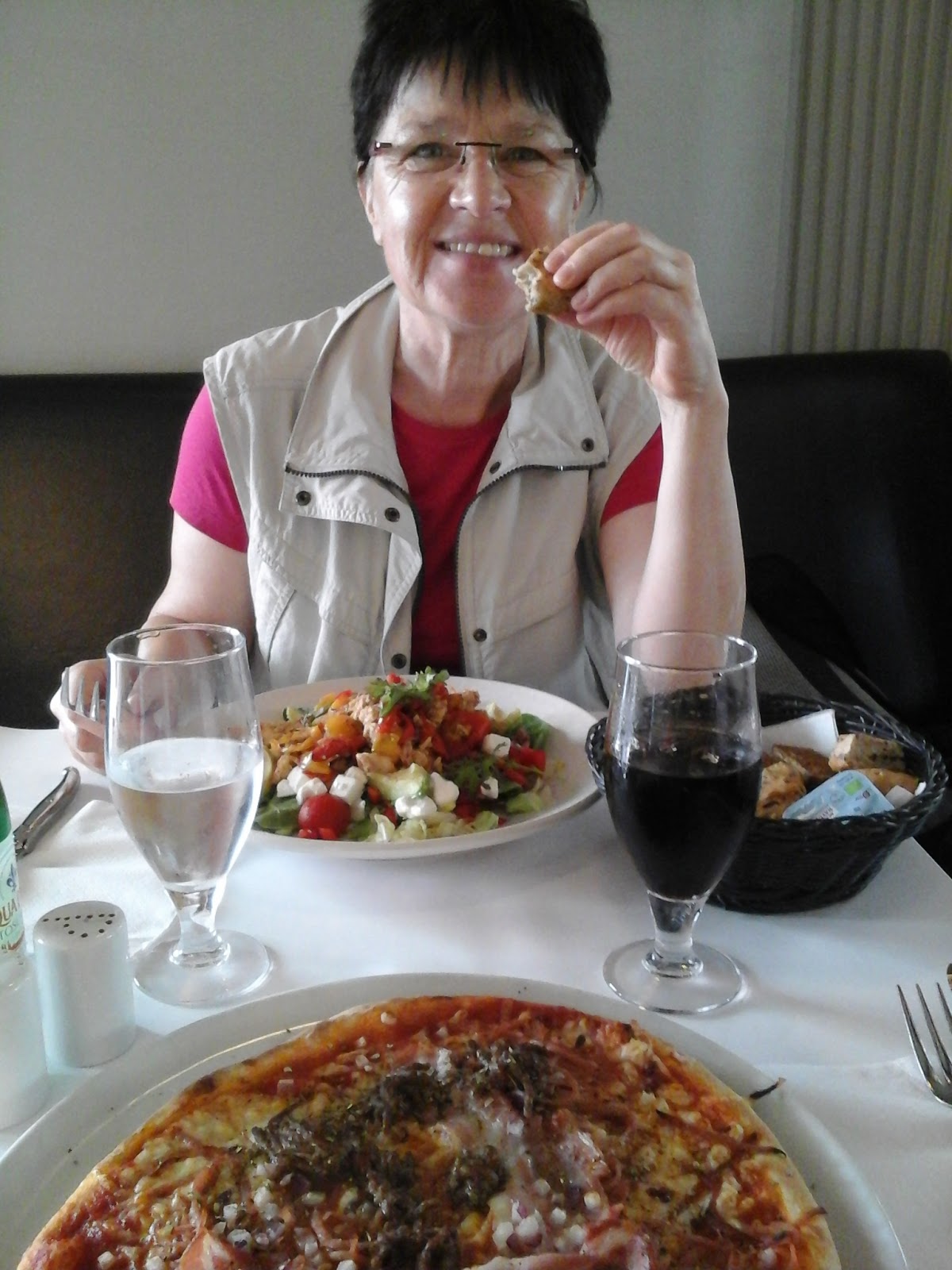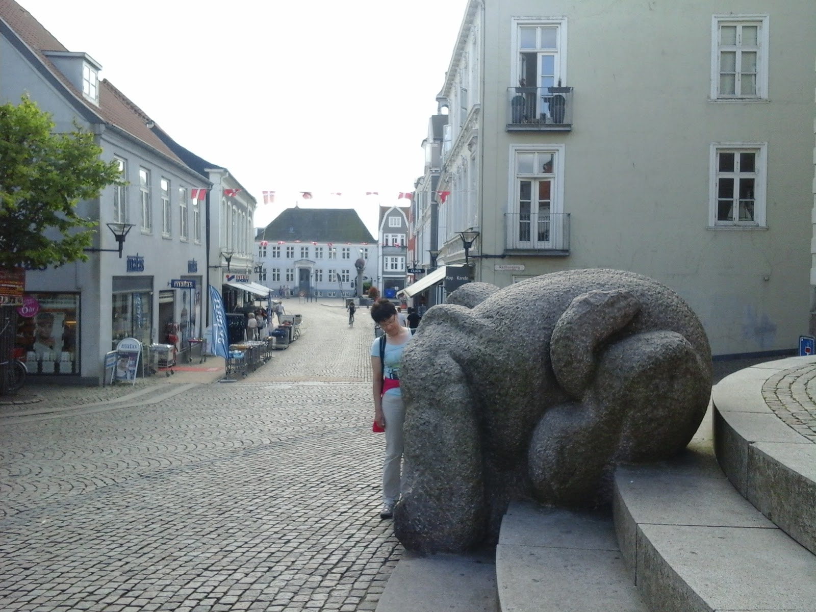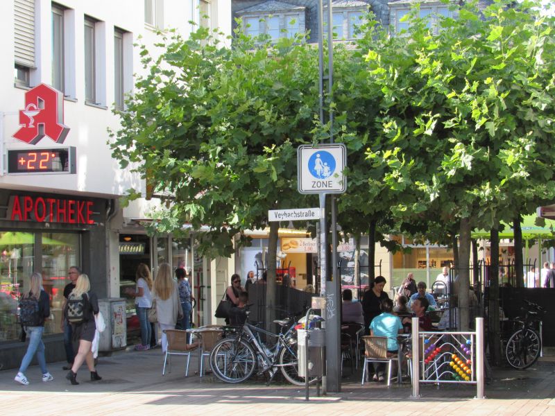 Nachmittags um 16:30 Uhr habe ich dieses Foto in Euskirchen aufgenommen. Wie man sieht, 22°, die Menschen sind sommerlich gekleidet, sitzen draußen im Straßencafe.