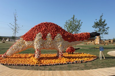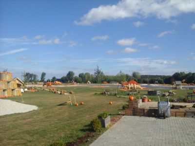 Hinter dem Hofladen und Cafe ist ein Kürbispark aufgebaut worden, wo es Dinosaurier aus Kürbissen gibt. (Ich habe es nur von aussen fotografiert)