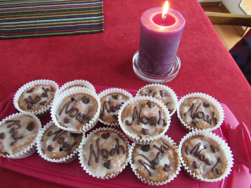 Brigitte hat für ein Familientreffen mit Noah, kleine Muffins gebacken, die mit seinem Namen verziert waren.