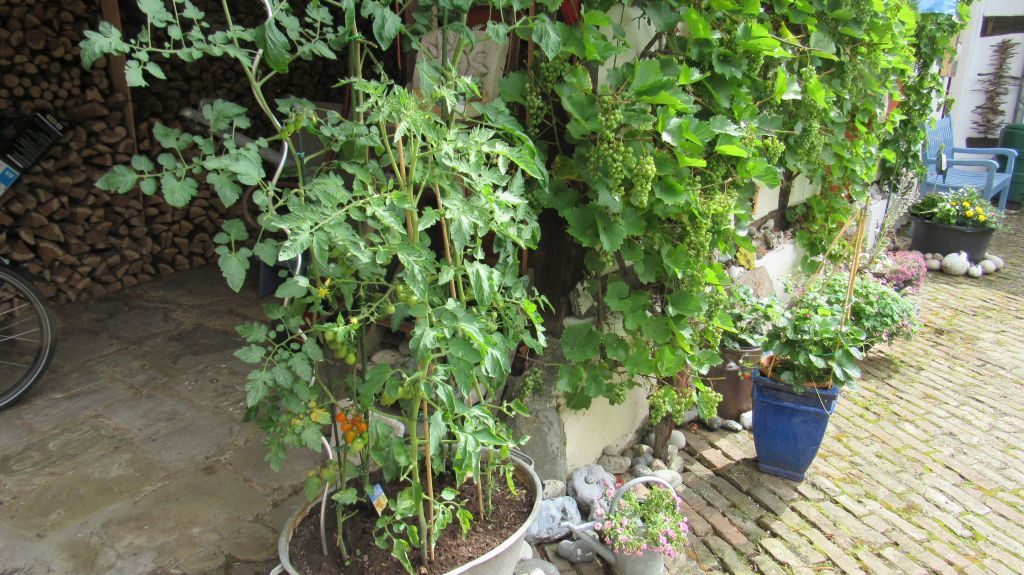 Im Hof werden die Tomaten reif und es gibt jeden Tag ein paar Erdbeeren: