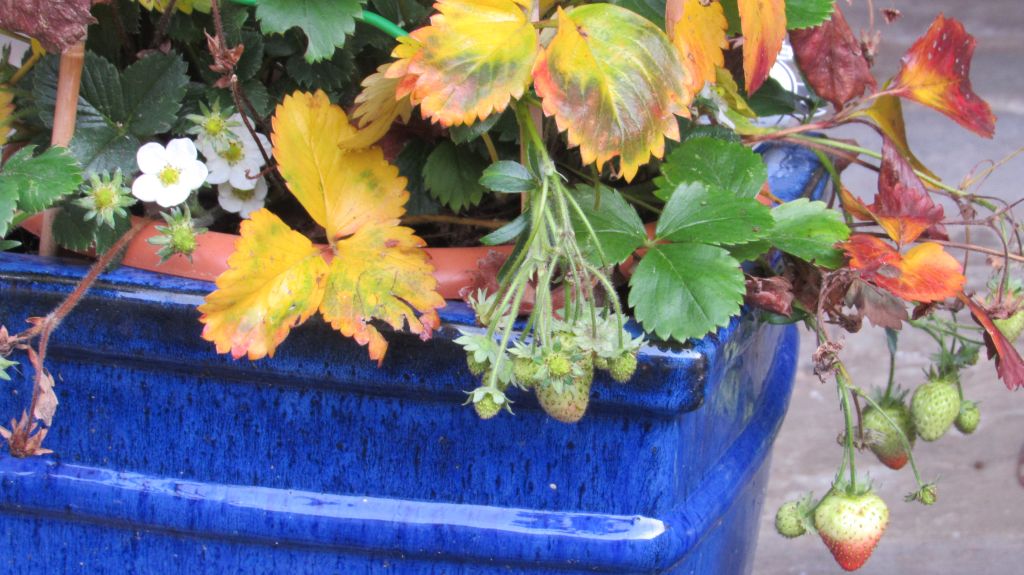 Die Erdbeeren produzieren immer noch neue Früchte, die aber nicht mehr richtig rot werden.