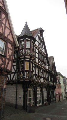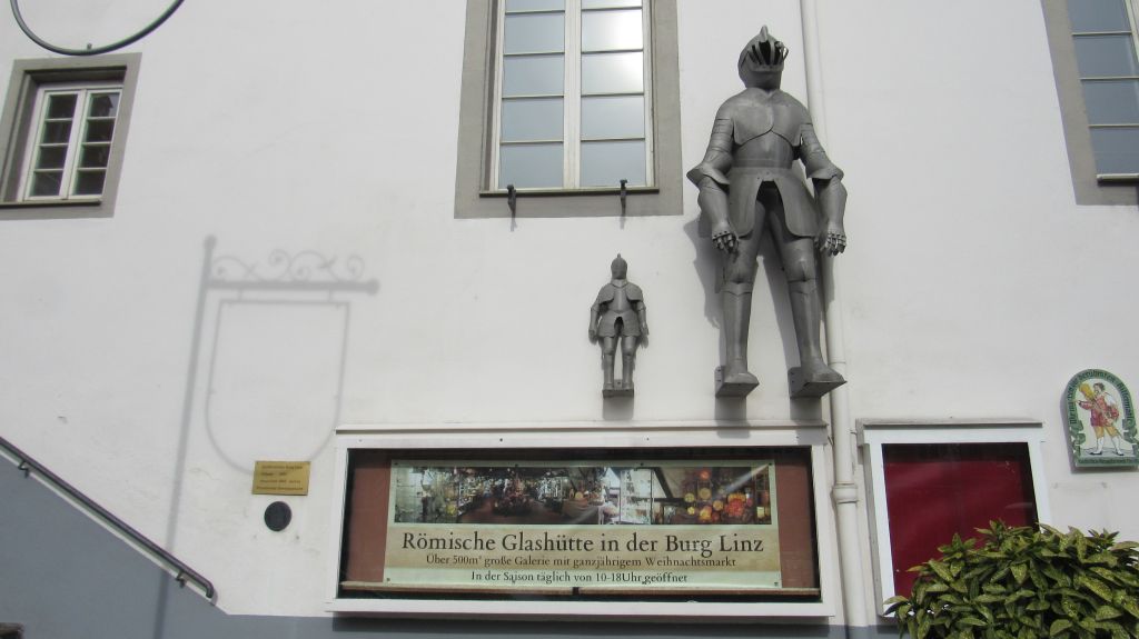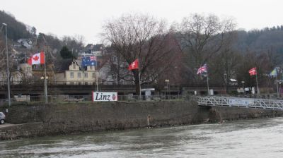 Als erstes sah ich von der Fähre aus die Fahnen, die in Linz am Rheinufer wehten.