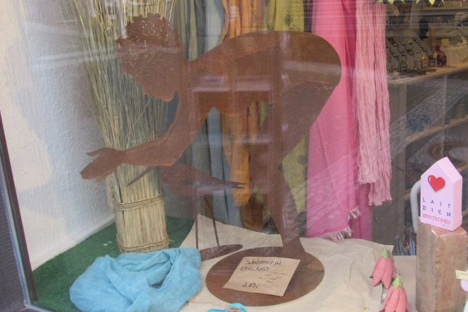 Und zu guter letzt sah ich in einem Schaufenster diese badende Frau. Kunst aus Eisen. Genau die gleiche Figur gibt es bei I&I, Christina Prütz auf Öland.