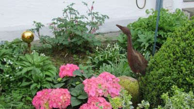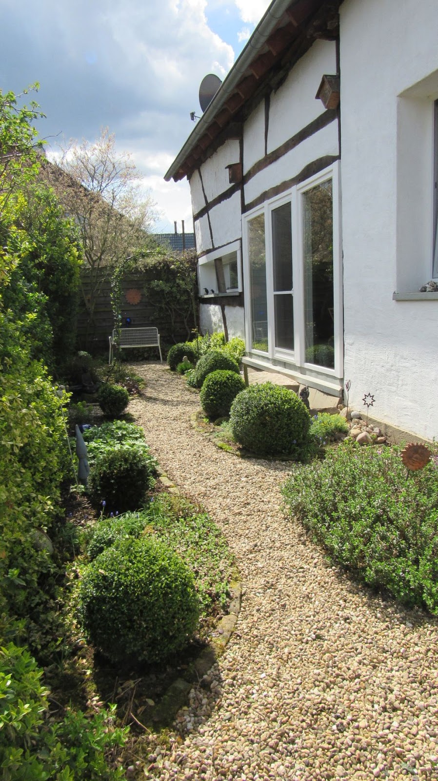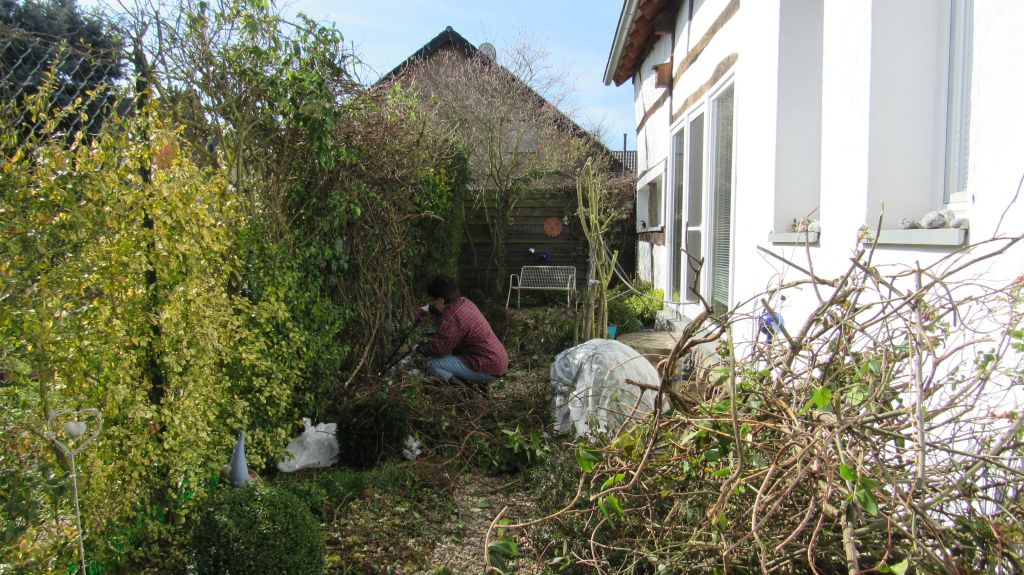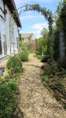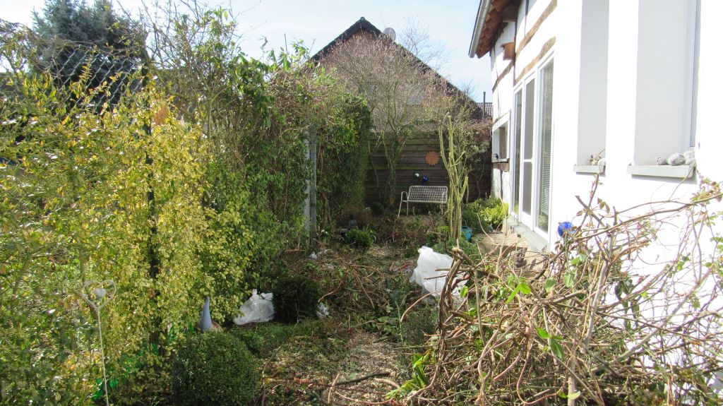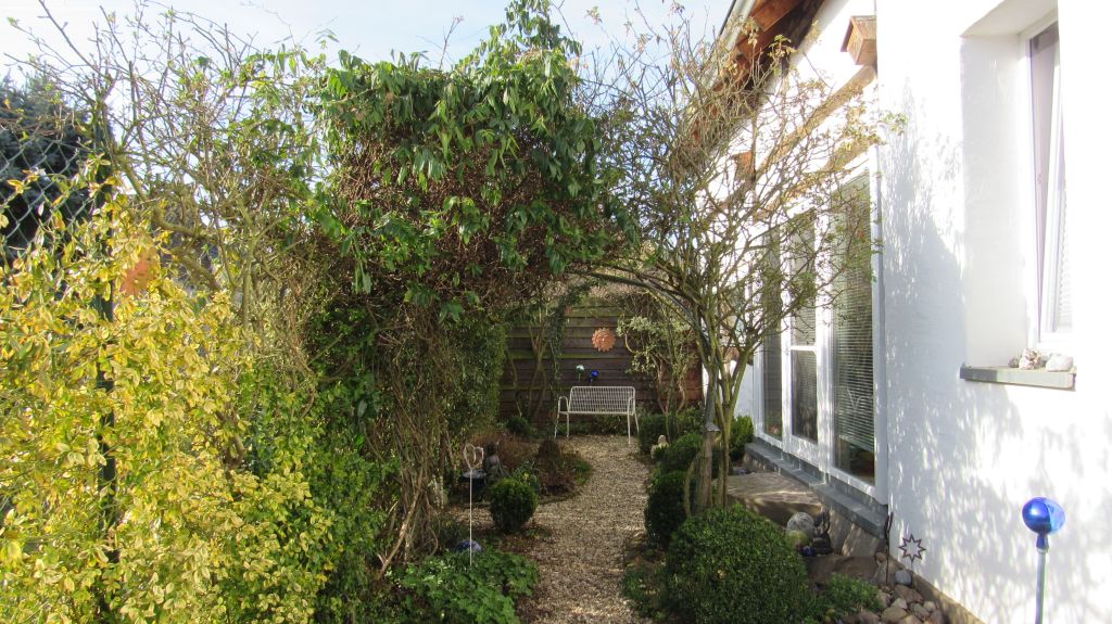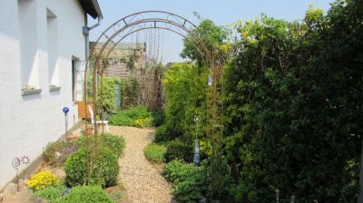Was gibt es im Garten Neues? Der neue stabile Rosenbogen steht und es wachsen rechts und links neue Clematis hoch.