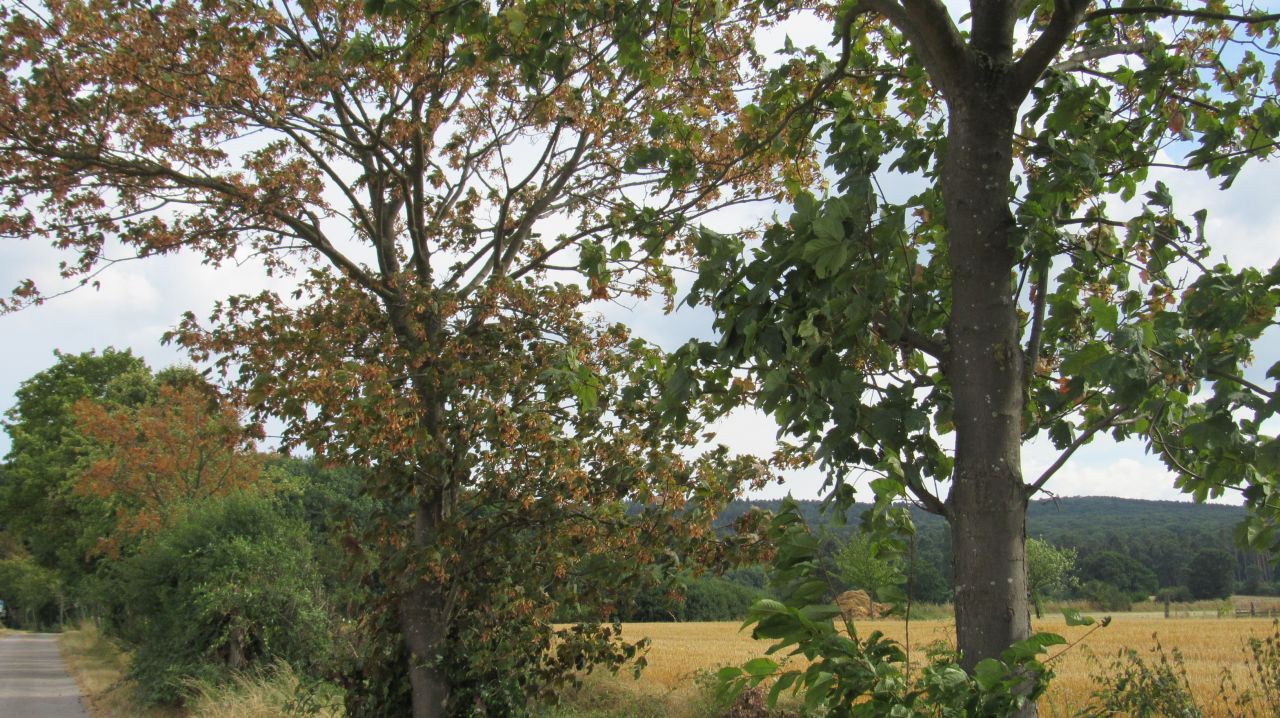 Die Bäume wirken schon sehr herbstlich. Die Blätter vertrocknen: