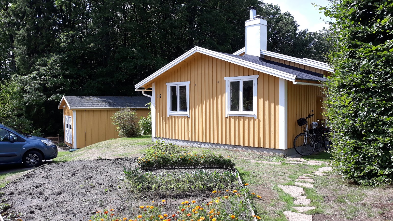 Wir haben eine schöne gelbe Stugar gemietet, die direkt an einem Wildbach liegt.