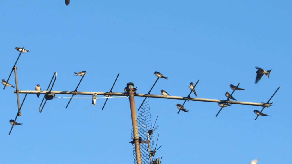 Zuerst einmal Schwalben: sie sammeln sich schon und da es kaum noch Oberleitungen gibt, suchen sie andere Plätze, wie hier zufällig diese alte Antenne: