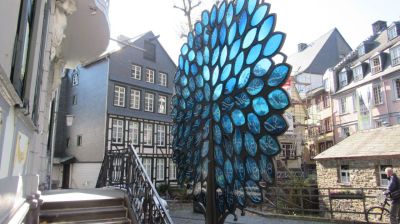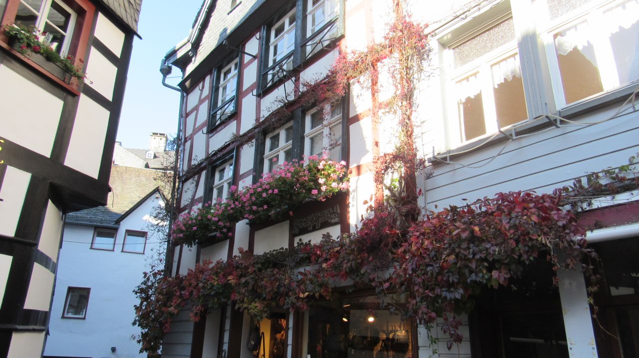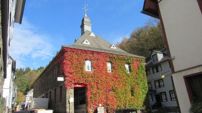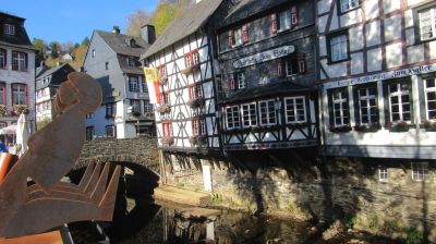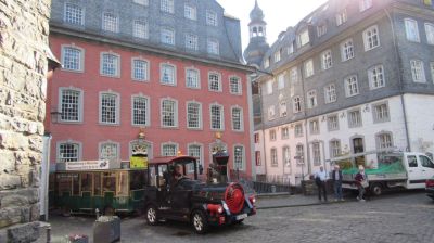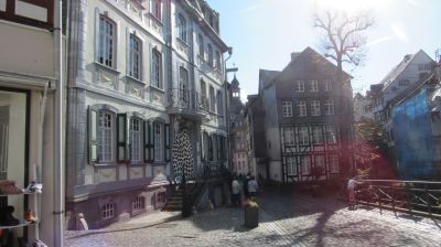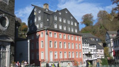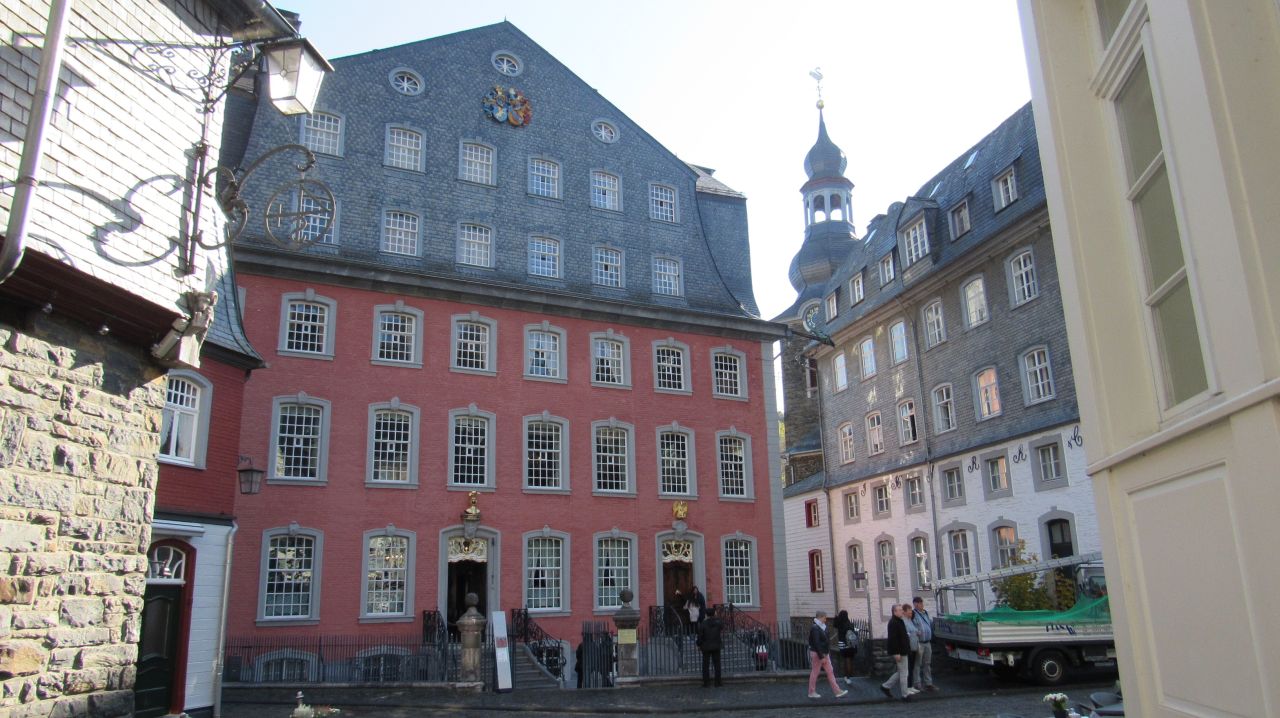 Durch Monschau fließt die Rur und der Ort war bekannt für seine Textilindustrie. Seid dem 18. Jahrhundert bis in die 1980er Jahr wurde hier Feintuch produziert. Das heißt es war eine reiche Stadt. Um 1760 erbaute die Frabrikantenfamilie Scheibler das prachtvolle rote Haus, was heute noch Mittelpunkt und Anziehungpunkt von Monschau ist.