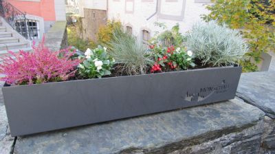 Alles ist schön gestaltet. Beim Blumenkasten angefangen. Jeder Blumenkasten trägt das Emblem der Stadt.