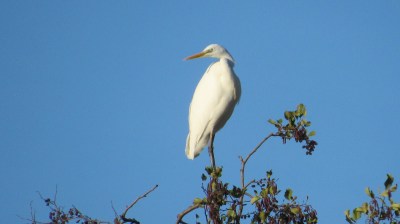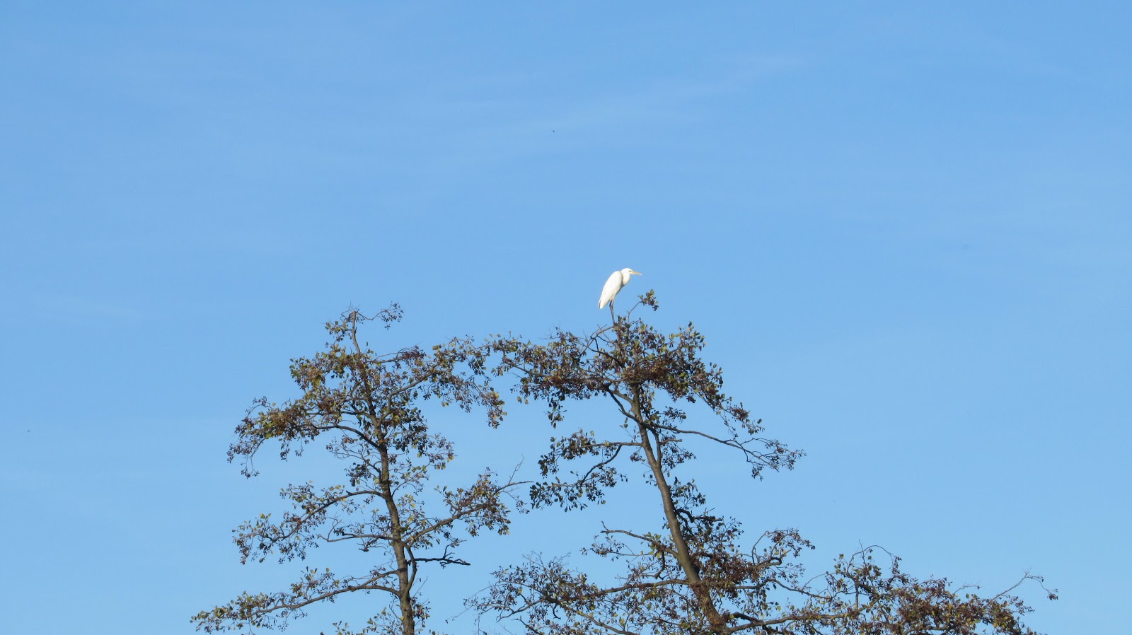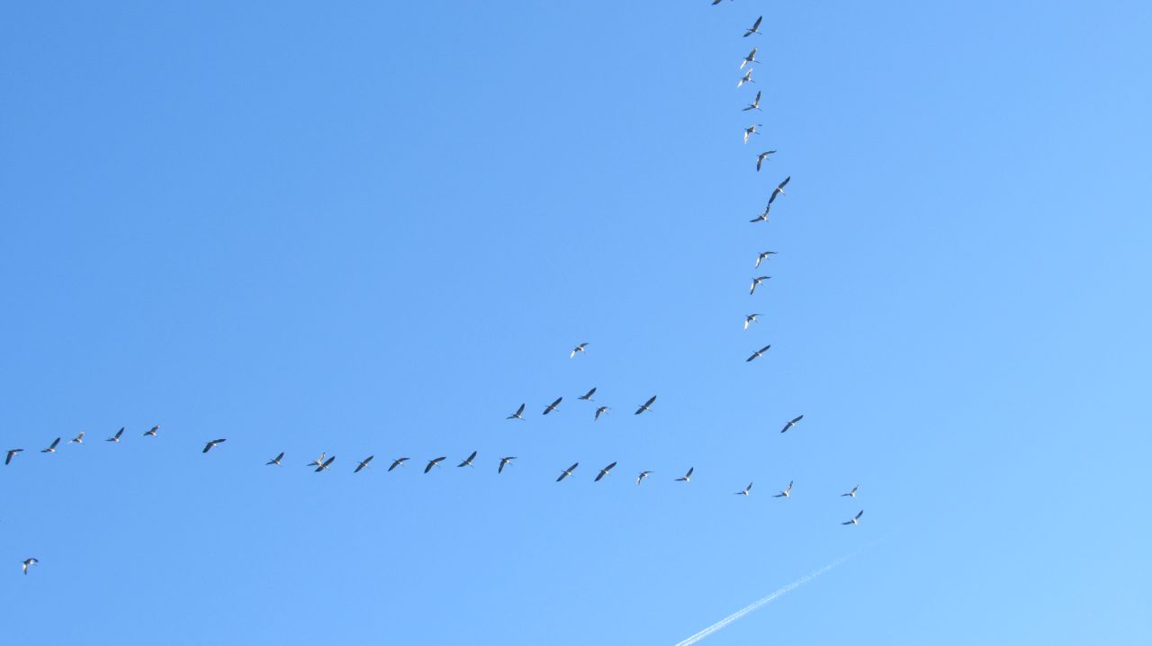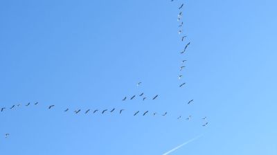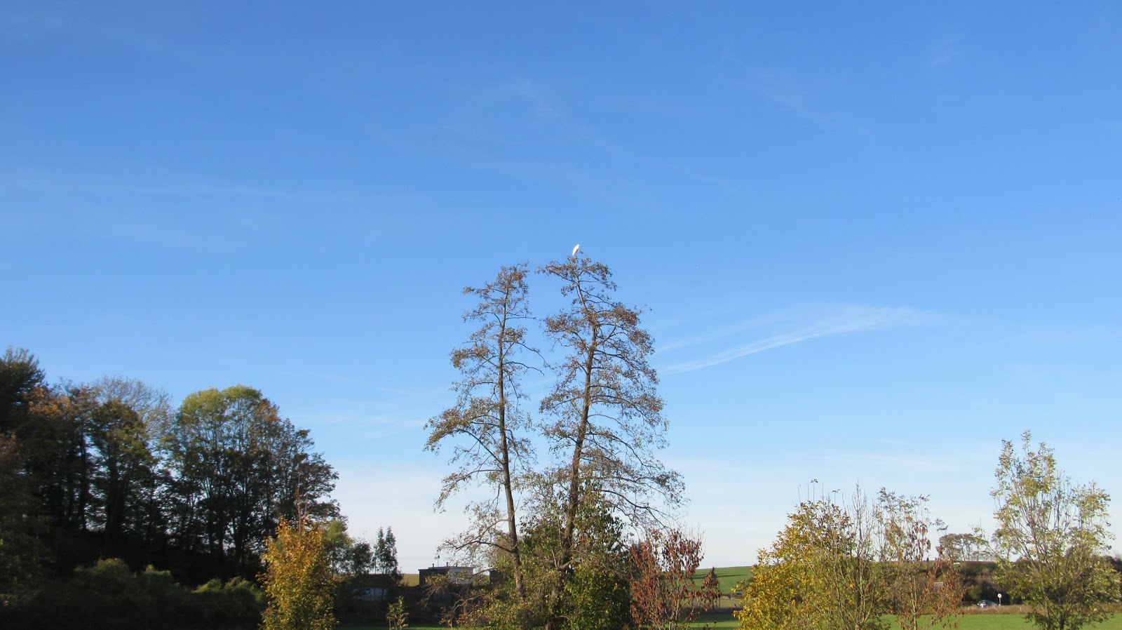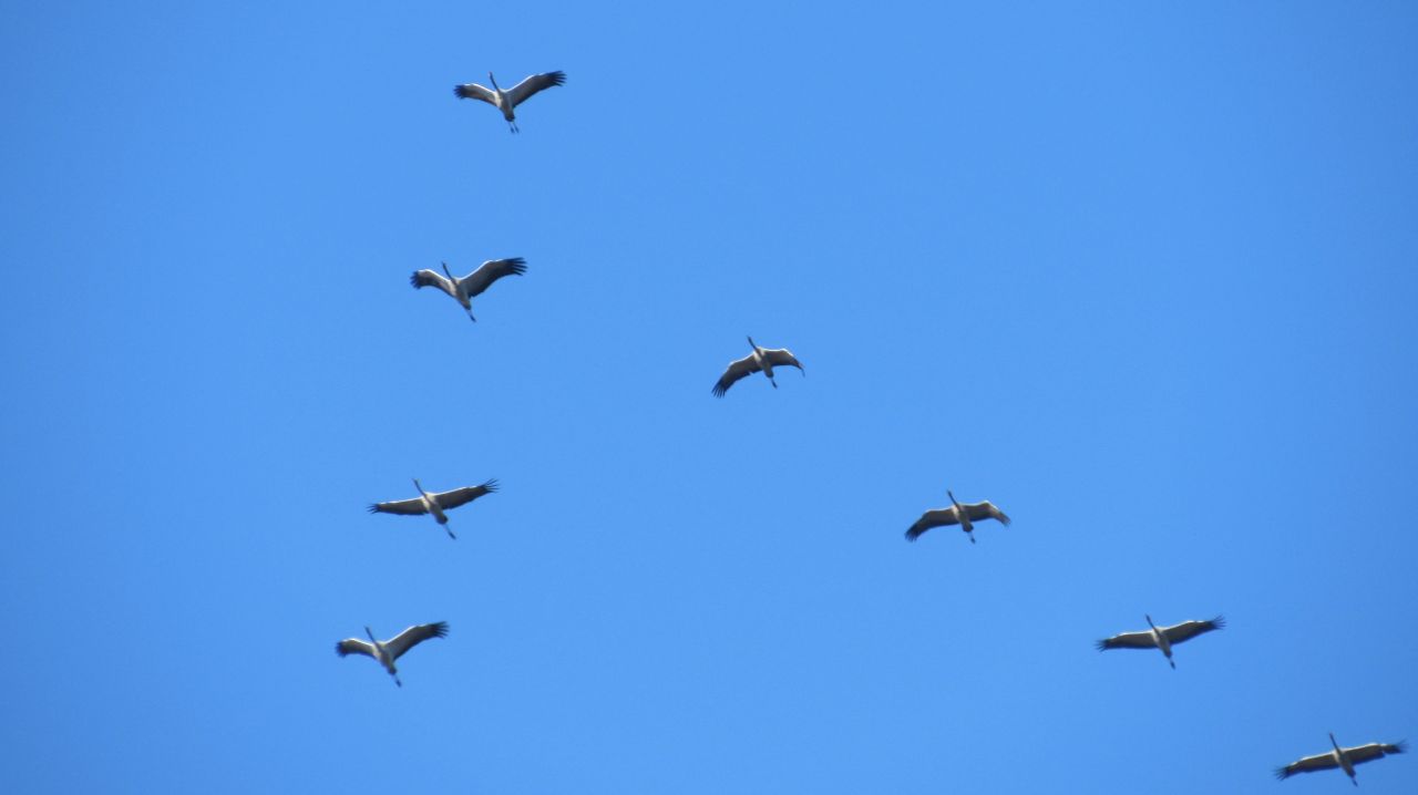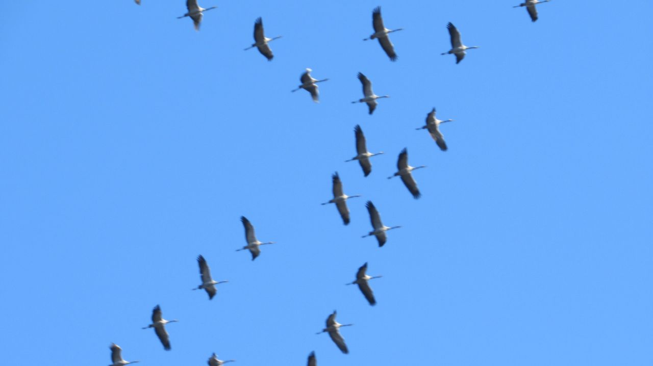 Und immer wieder über uns am blauen Himmel, laut schnatternde Kraniche. Wahrscheinlich jetzt die letzten, die nach Spanien ziehen.