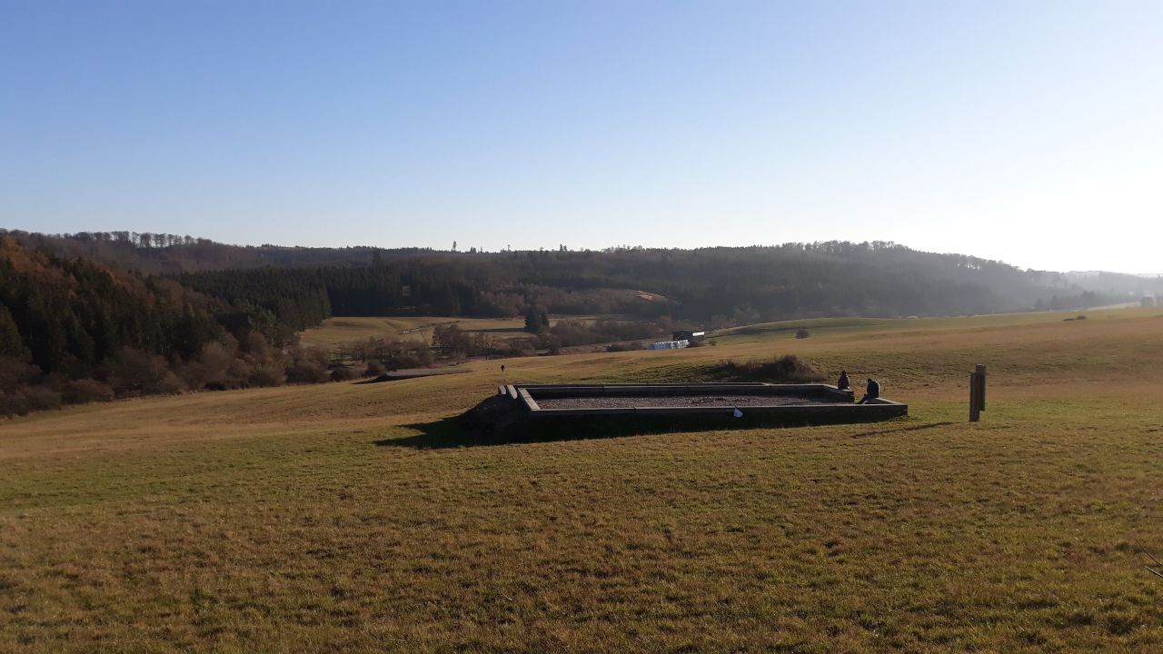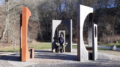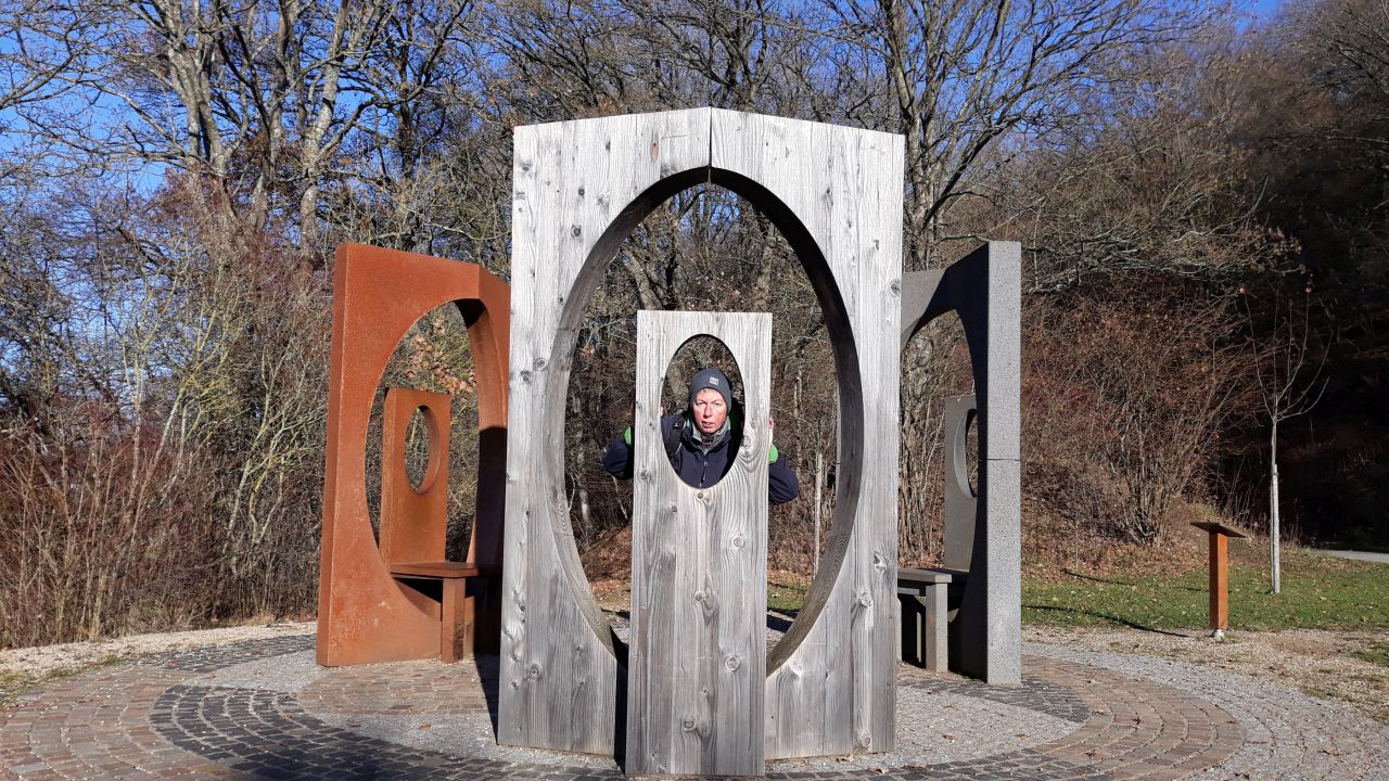 Von Nettersheim aus kommend, trifft man zuerst auf die „Macht der Drei“ ein Kunstwerk zu den Matronen von Birgit Sommer.